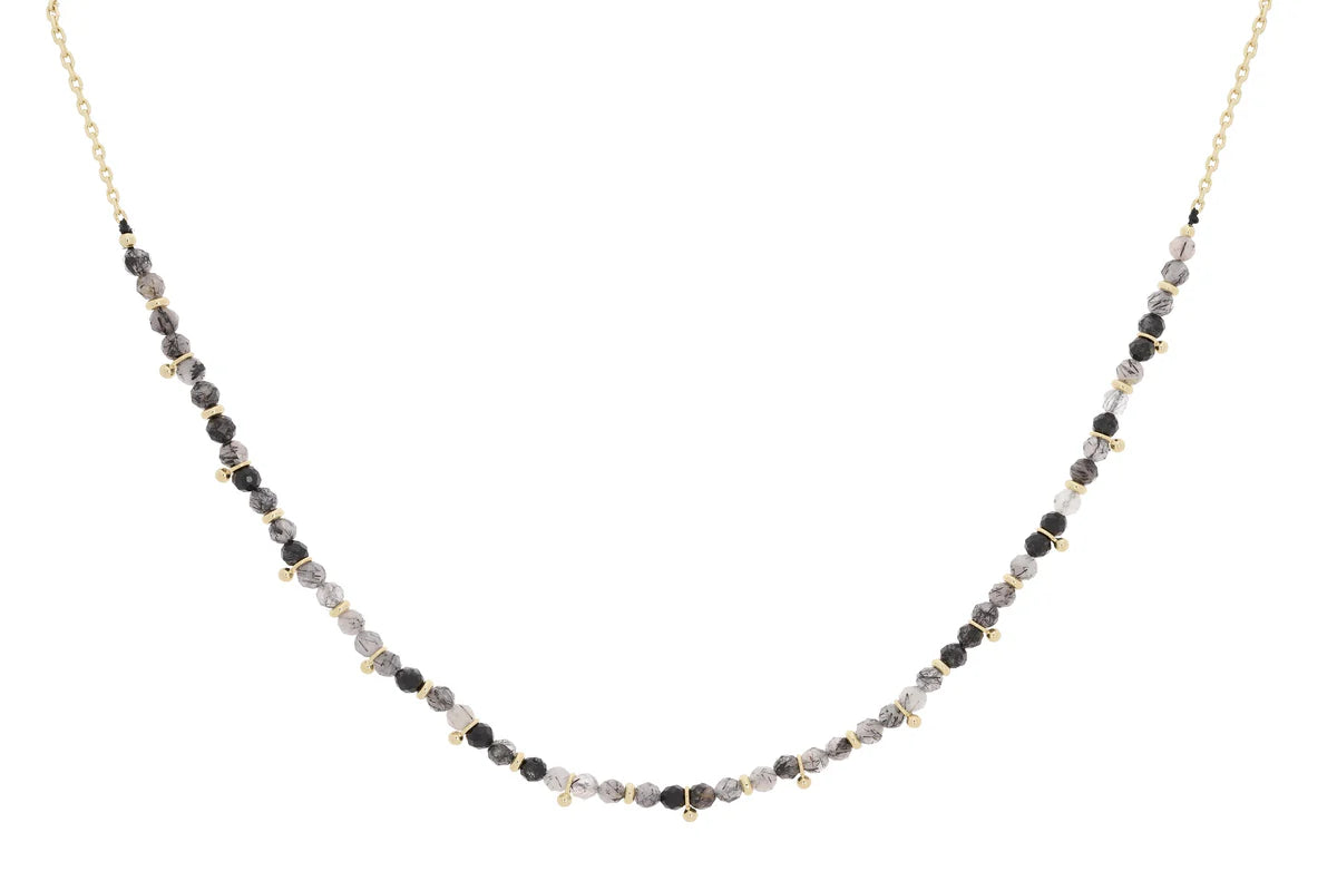 Refined, modern, and quietly striking, this necklace features black rutilite gemstone beads - clear to smoky quartz threaded with inky, natural rutile formations that make each bead one of a kind. Set on a gold plated chain, it brings a subtle touch of texture and depth to any look.