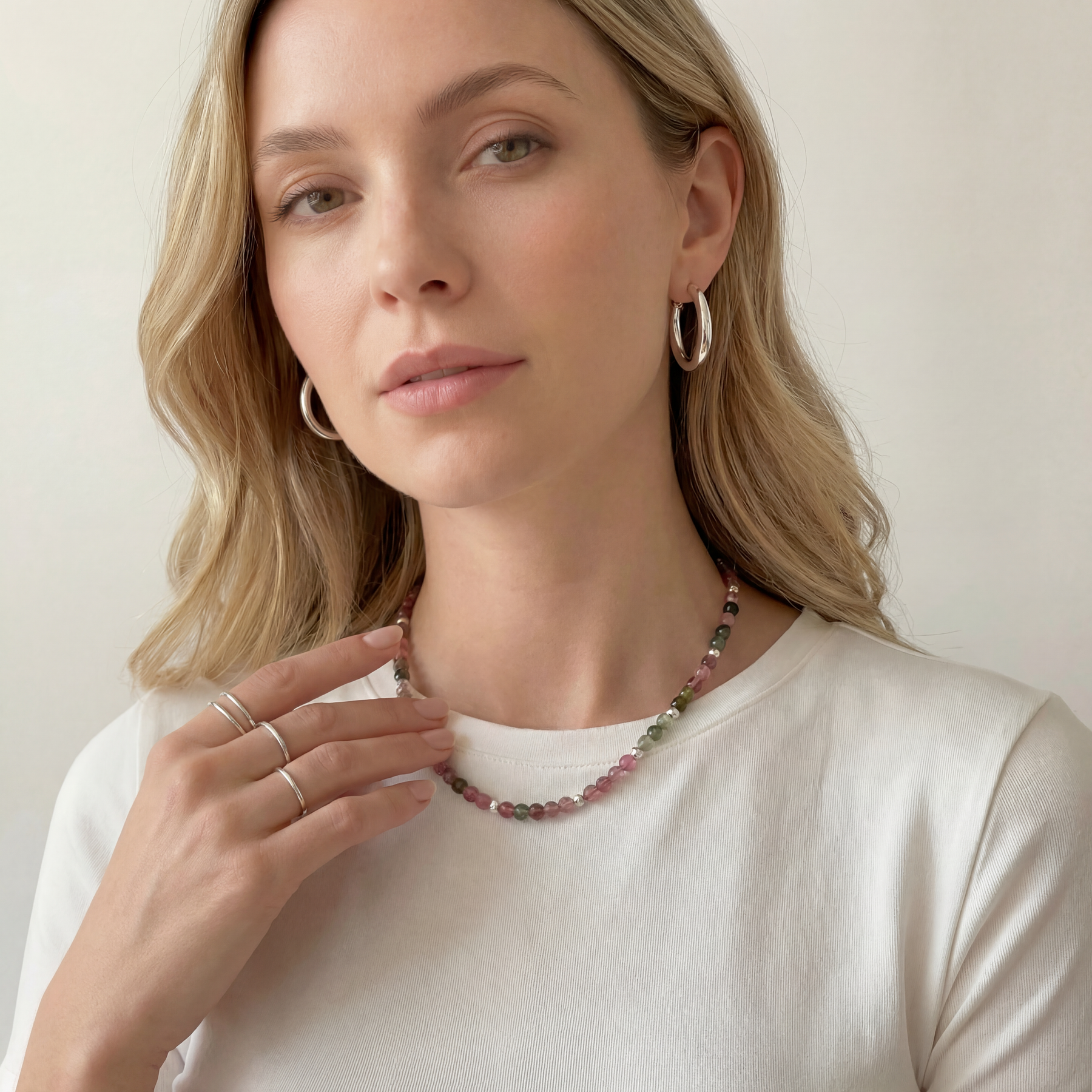 This Rainbow Tourmaline beaded necklace is a refined, everyday piece designed to sit gracefully just below the collarbone. Crafted with smooth 4 mm natural Rainbow Tourmaline beads, it offers a harmonious balance of colour, softness, and meaning.