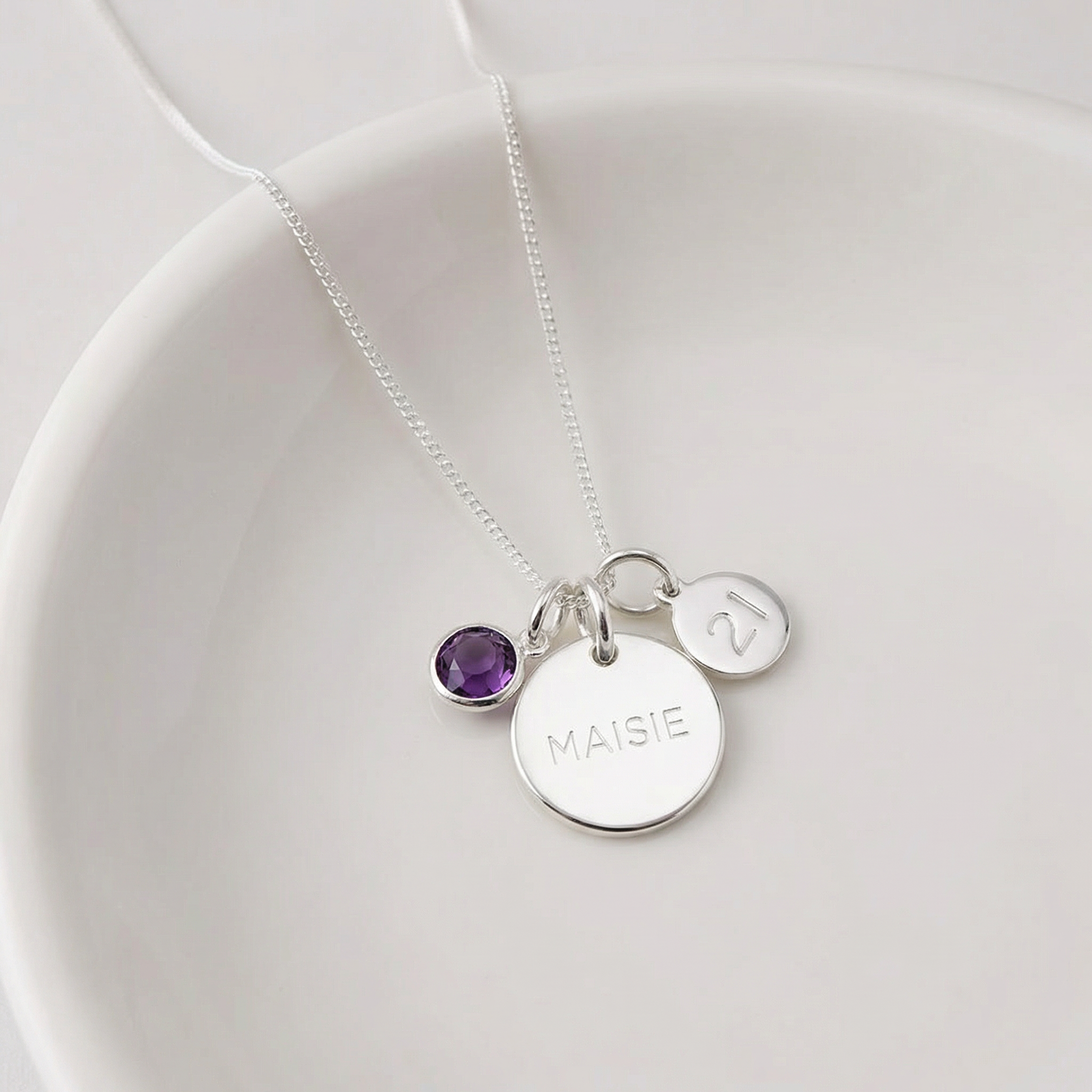 This elegant piece features a 15mm sterling silver disc engraved with a name of your choice (up to 10 characters), paired with a smaller 8mm sterling silver disc engraved with their birthday age. Completing the design is a sparkling birthstone crystal, representing the month they were born.