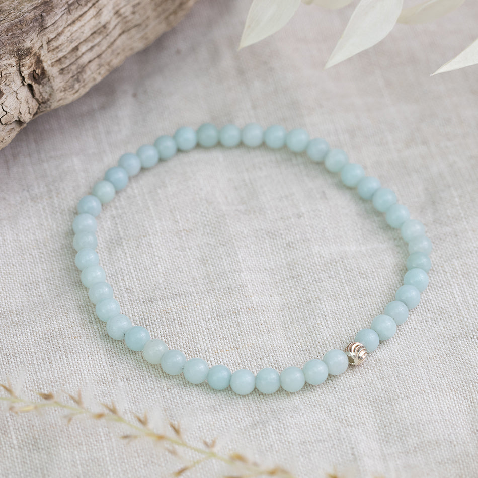 Amazonite is a soothing stone. With it's beautiful soft pastel colours it calms the brain and nervous system and aids in maintaining optimum health. This gemstone bracelet is made with Grade A authentic gemstone beads. Includes a half moon cut sterling silver feature bead.