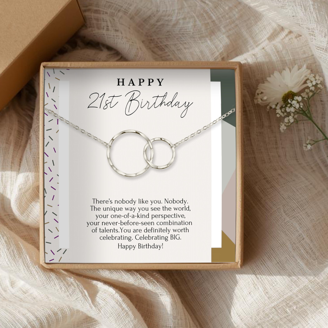 Your necklace arrives on a premium backing card that reads “Happy 21st Birthday” at the top, followed by a heartfelt message: