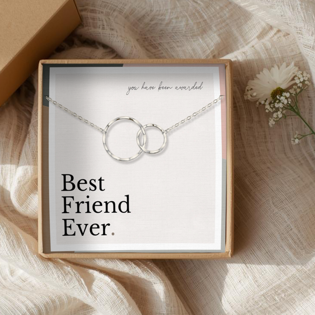 Your necklace comes presented on a premium backing card that reads in soft script, “You have been awarded…” followed by bold lettering declaring “Best Friend Ever.”