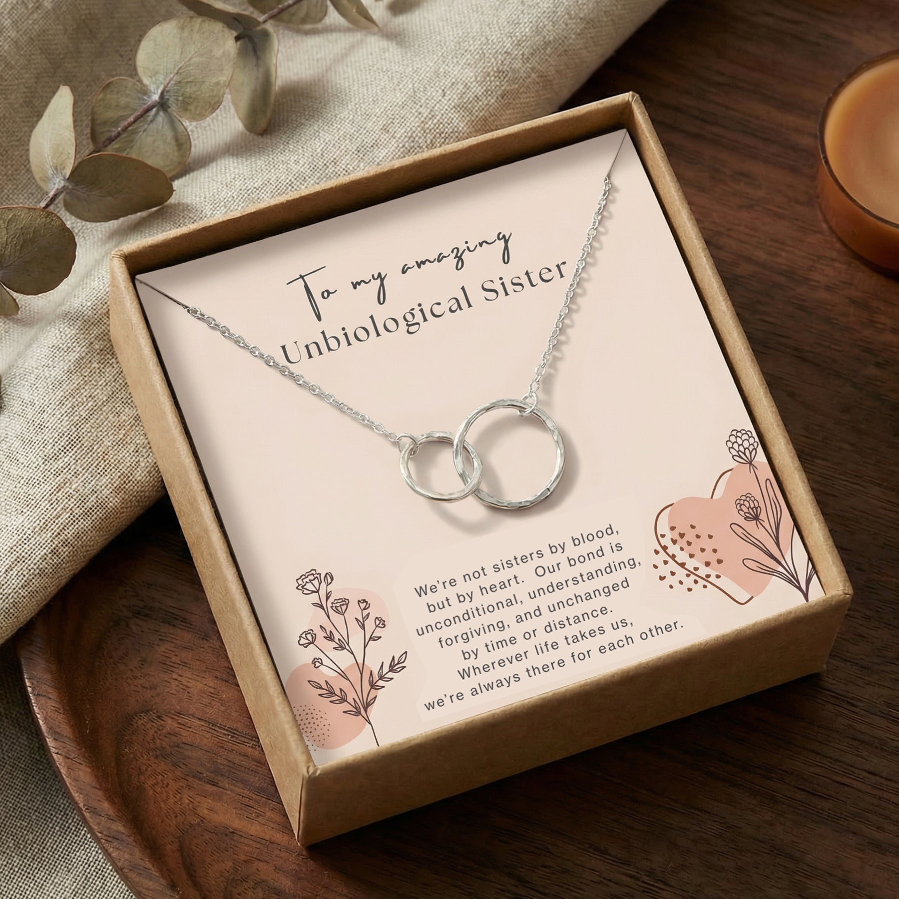 Your necklace arrives on a premium backing card titled “To My Amazing Unbiological Sister”, followed by this touching message:
