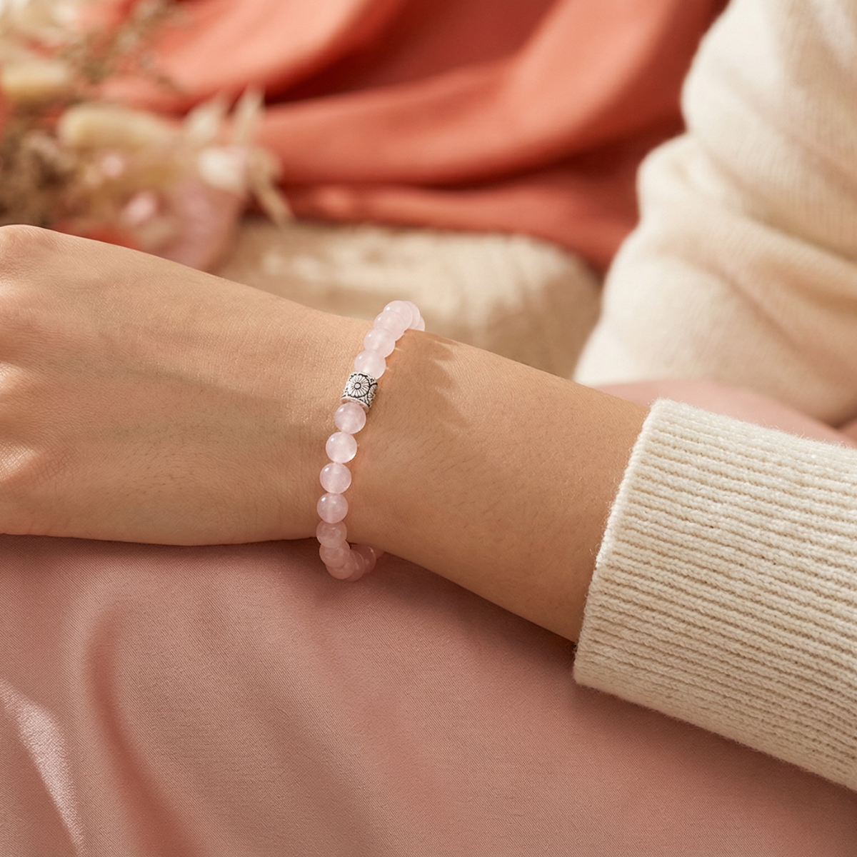 Rose Quartz beaded bracelet made with 6mm smooth polished round natural beads with a sterling silver flower accent bead.