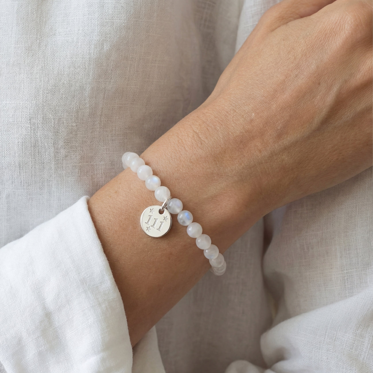 At the centre of the bracelet sits a 12 mm solid sterling silver charm, engraved with the angel number 111 and delicate star detailing. The engraving adds a gentle celestial detail while keeping the overall design refined and understated. A polished sterling silver barrel bead completes the bracelet, adding balance and a clean silver accent.