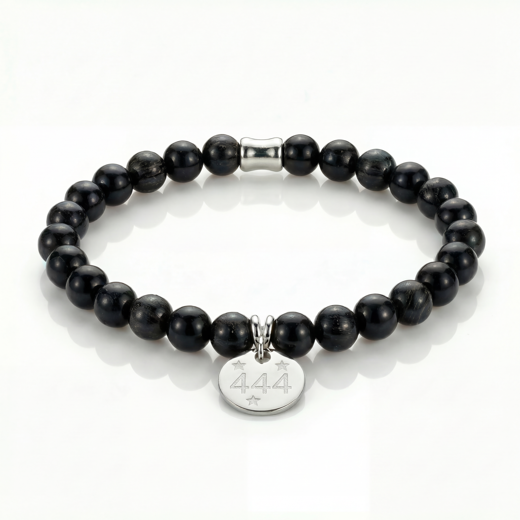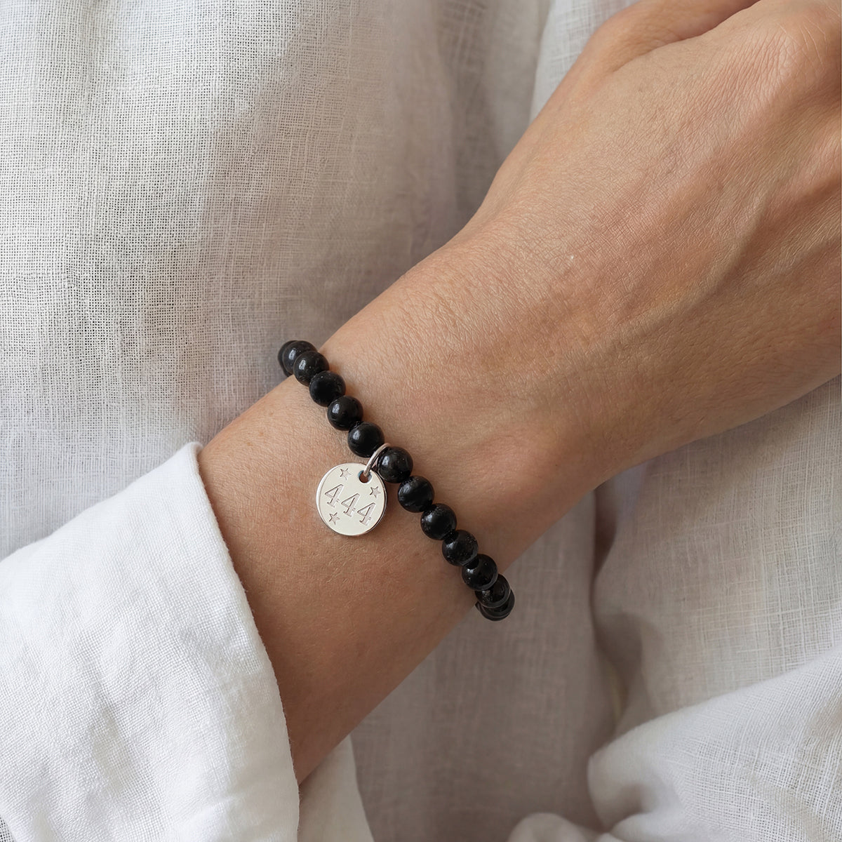 At the centre of the bracelet sits a 12 mm solid sterling silver charm, engraved with the angel number 444 and delicate star detailing. The engraving adds a subtle celestial touch while keeping the overall design refined and understated. A polished sterling silver barrel bead completes the bracelet, providing balance and a clean silver accent.