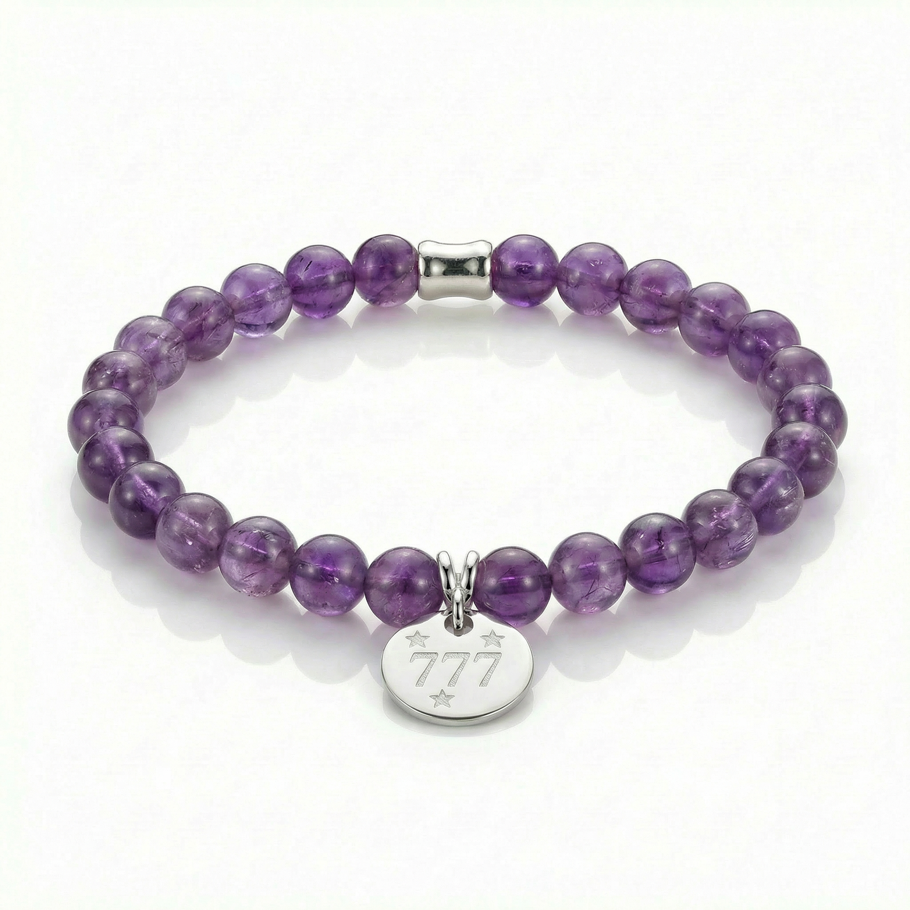 Amethyst is known as a stone of clarity and spiritual protection. It is commonly associated with calming the mind, enhancing intuition, and supporting emotional balance. Paired with angel number 777, it creates a bracelet that feels thoughtful, steady, and deeply supportive.