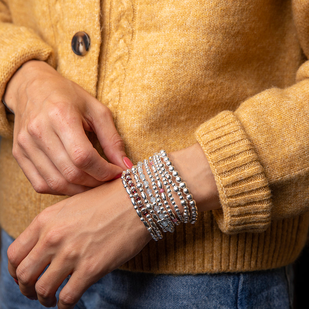 This bracelet is made with 4mm sterling silver beads and finished with six faceted birthstone crystals at the front. It’s simple, easy to wear, and carries a personal touch - whether you choose your own birthstone, one for someone you love, or mix a few together to mark special birthdays. Wear it on its own for a bit of everyday sparkle, or stack it up with other bracelets from our Create Your Own Stack collection to tell your story.