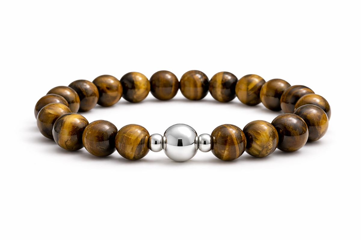 Crafted from smooth 8mm natural Tiger Eye beads, this bracelet showcases the stone’s rich golden-brown bands and signature chatoyancy – a subtle light that moves across the surface like sunlight through wood grain.